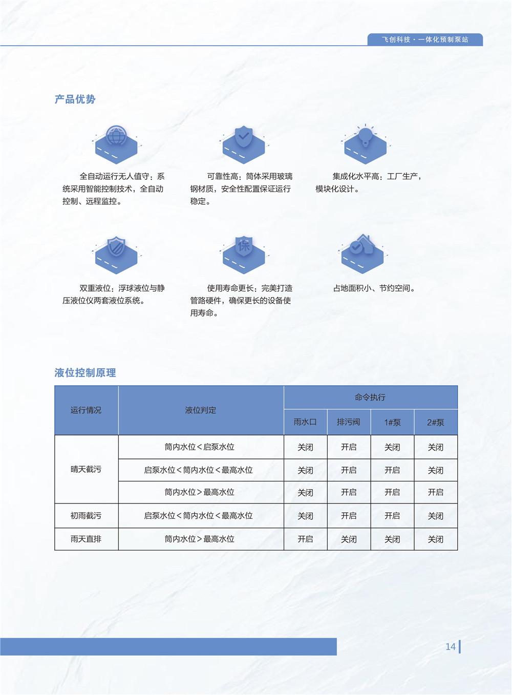 4.一體化汙水智能控製係統,該係統智能監控設備運行情況,高液位自動開啟,低液位自動停止,超低液位保護並報警。配合手機端和PC端專用控製軟件,可遠程啟停設備,遠程查看設備動態運行情況,實時數據,報警信息等。