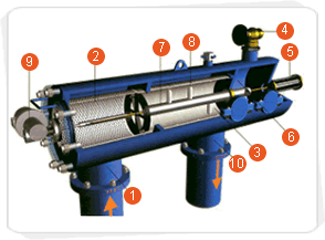 水由入水口(1)進入,首先經過粗濾網(2)過濾掉較大顆粒的雜質,然後達到細濾網(3)將(jiang)較(jiao)小(xiao)顆(ke)粒(li)雜(za)質(zhi)從(cong)水(shui)中(zhong)濾(lv)去(qu)。隨(sui)著(zhe)水(shui)流(liu)的(de)不(bu)斷(duan)經(jing)過(guo),水(shui)中(zhong)的(de)髒(zang)物(wu)及(ji)雜(za)質(zhi)不(bu)斷(duan)在(zai)細(xi)濾(lv)網(wang)內(nei)側(ce)累(lei)積(ji),逐(zhu)漸(jian)在(zai)細(xi)濾(lv)網(wang)的(de)內(nei)外(wai)兩(liang)側(ce)形(xing)成(cheng)一(yi)個(ge)壓(ya)力(li)差(cha)。