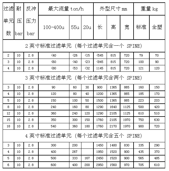 1.自動疊片過濾單元有 2″、3″、4″、6″、12″可選,每個單元由濾殼與濾芯組成。濾殼為標準部件,材質有纖維增強尼龍、PP、不鏽鋼、聚酯噴塗碳鋼等多種選擇。各個精度的濾芯為同一尺寸規格,疊片材質有 PP與(yu)尼(ni)龍(long)可(ke)選(xuan),疊(die)片(pian)兩(liang)麵(mian)注(zhu)有(you)正(zheng)三(san)角(jiao)形(xing)溝(gou)槽(cao),溝(gou)槽(cao)內(nei)切(qie)圓(yuan)直(zhi)徑(jing)為(wei)疊(die)片(pian)的(de)過(guo)濾(lv)精(jing)度(du)。一(yi)定(ding)數(shu)量(liang)的(de)疊(die)片(pian)穿(chuan)在(zai)一(yi)個(ge)內(nei)撐(cheng)上(shang),並(bing)在(zai)上(shang)蓋(gai)壓(ya)緊(jin)後(hou)便(bian)形(xing)成(cheng)一(yi)個(ge)自(zi)動(dong)疊(die)片(pian)濾(lv)芯(xin)。內(nei)撐(cheng)在(zai)過(guo)濾(lv)時(shi)起(qi)到(dao)壓(ya)緊(jin)疊(die)片(pian)的(de)作(zuo)用(yong),反(fan)洗(xi)時(shi)起(qi)到(dao)鬆(song)開(kai)疊(die)片(pian),並(bing)向(xiang)疊(die)片(pian)噴(pen)射(she)衝(chong)洗(xi)水(shui)的(de)作(zuo)用(yong)。