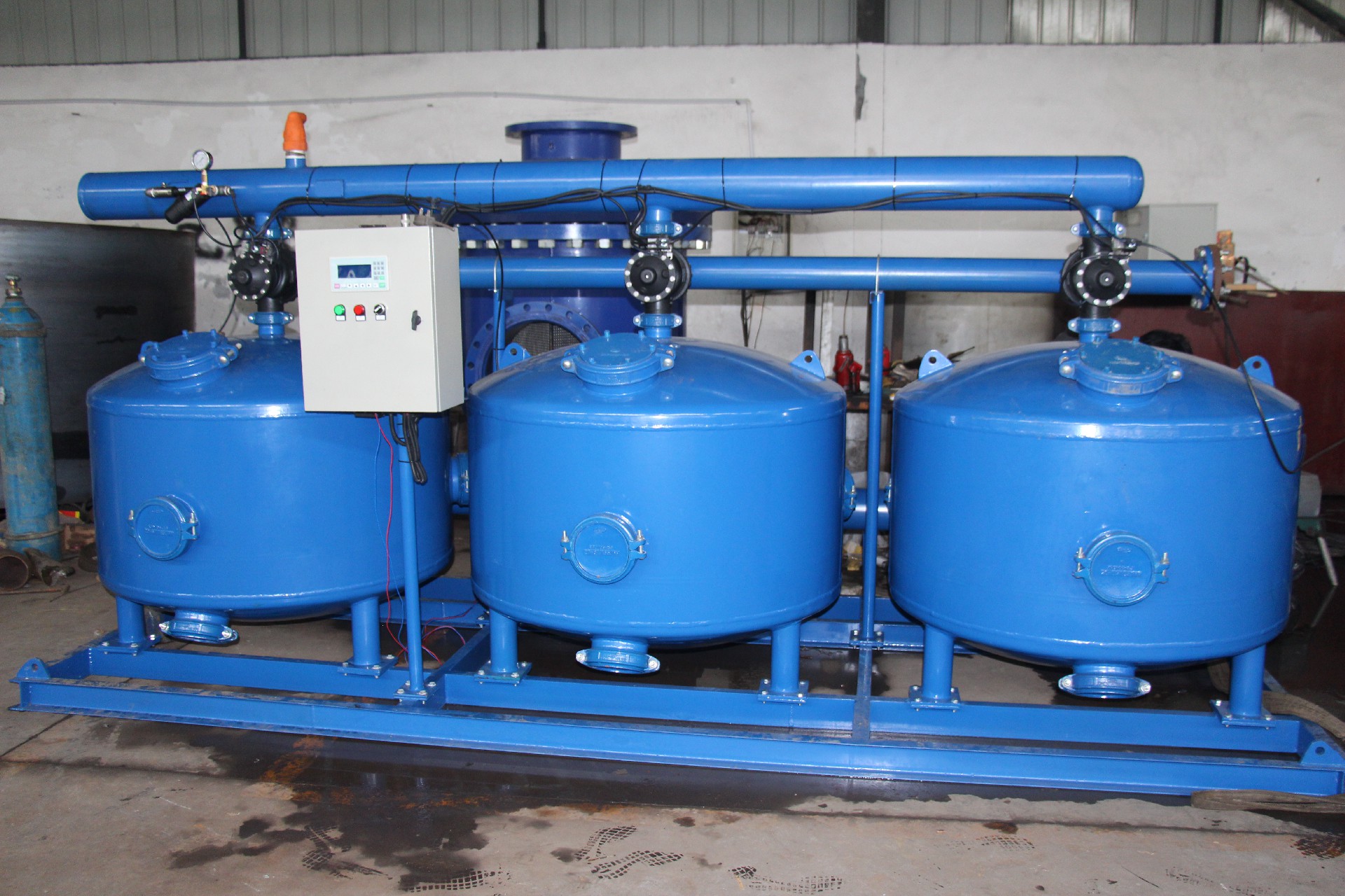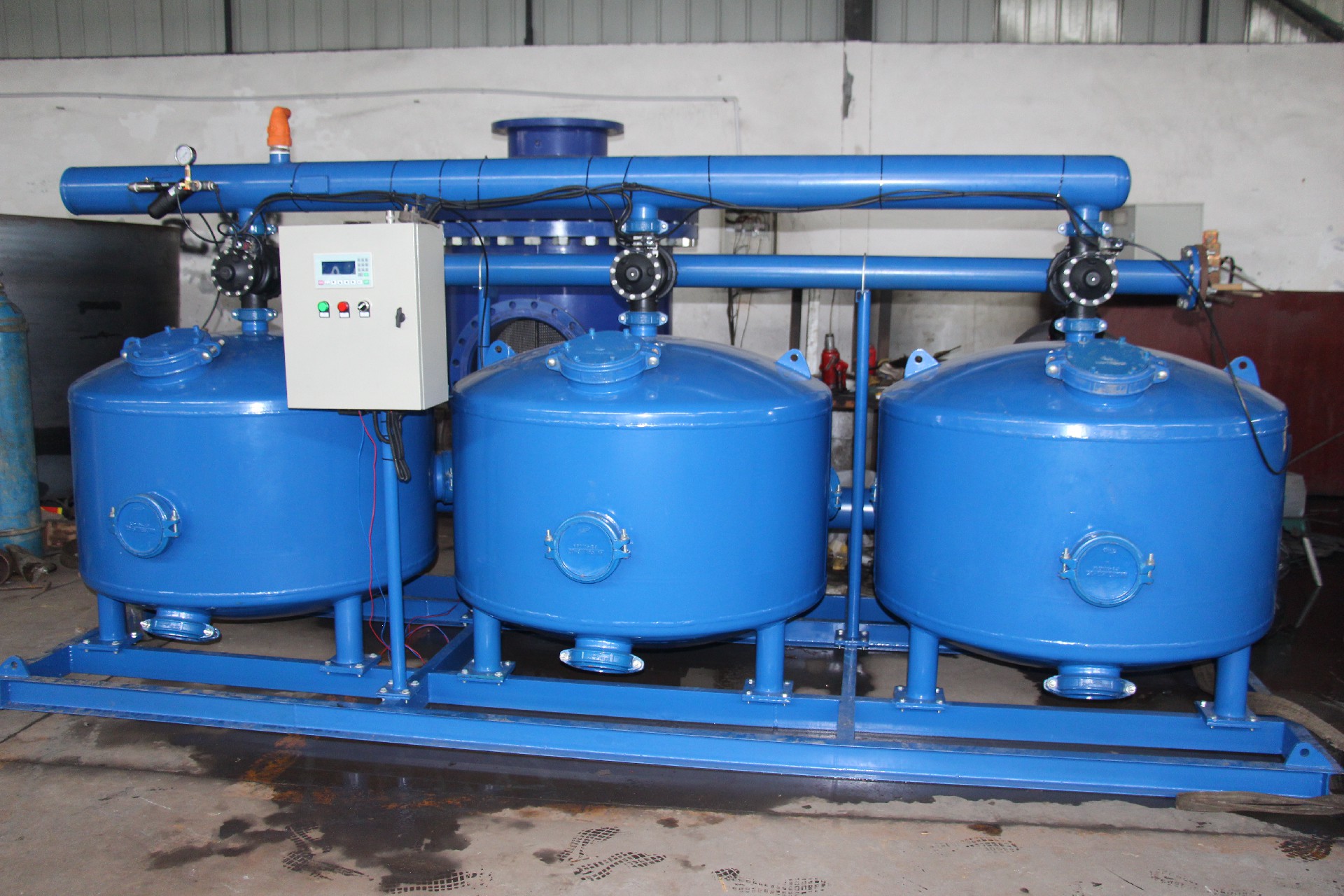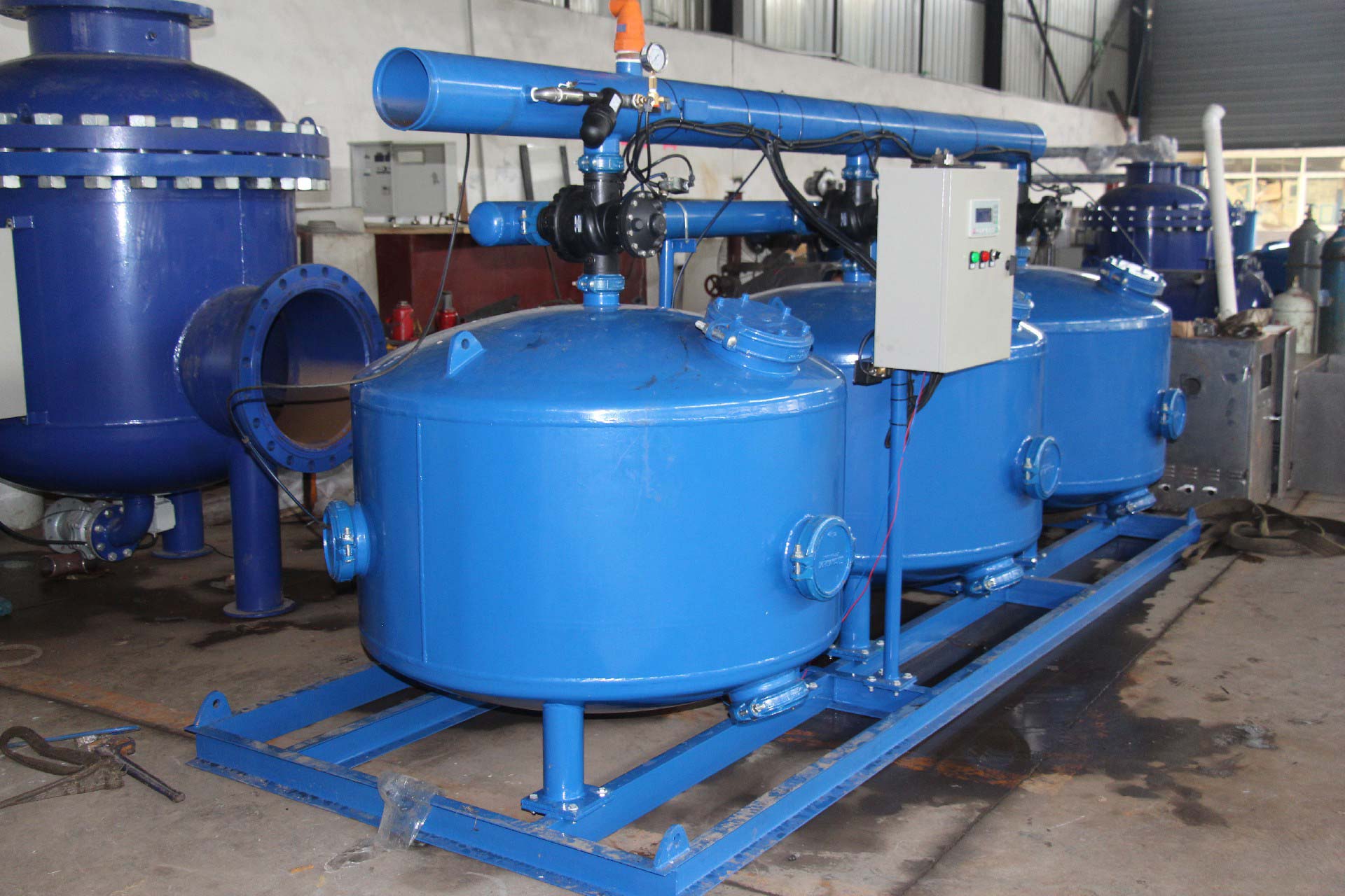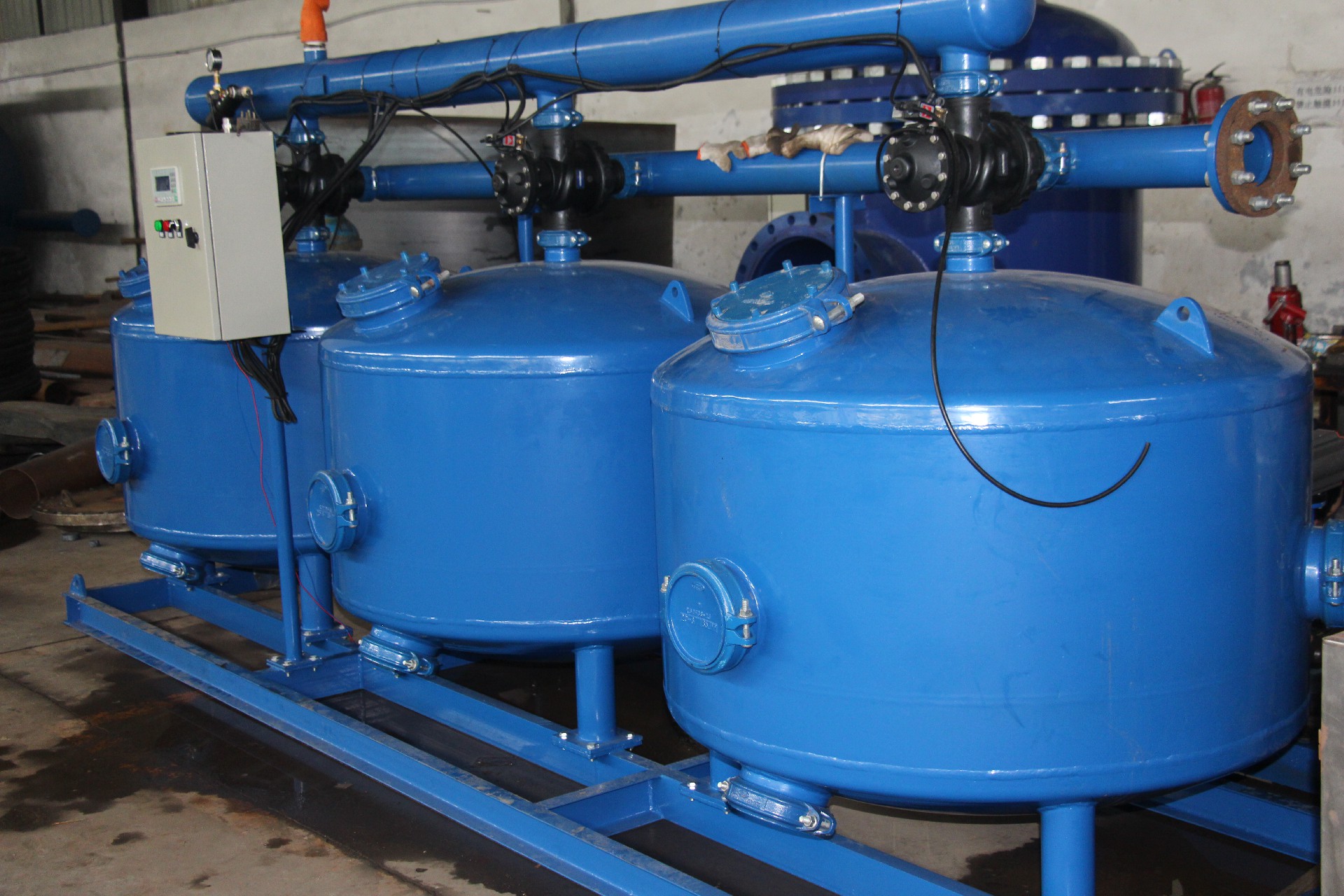 可(ke)采(cai)用(yong)時(shi)間(jian),壓(ya)差(cha)等(deng)多(duo)種(zhong)方(fang)式(shi)自(zi)動(dong)啟(qi)動(dong)反(fan)衝(chong)洗(xi),係(xi)統(tong)內(nei)各(ge)過(guo)濾(lv)器(qi)依(yi)次(ci)進(jin)行(xing)反(fan)衝(chong)洗(xi),其(qi)他(ta)過(guo)濾(lv)器(qi)仍(reng)然(ran)在(zai)過(guo)濾(lv),以(yi)保(bao)證(zheng)係(xi)統(tong)在(zai)反(fan)衝(chong)洗(xi)過(guo)程(cheng)中(zhong)不(bu)中(zhong)斷(duan)供(gong)水(shui)。