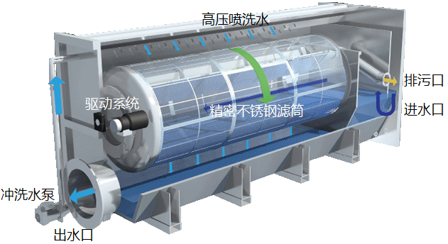 過濾器由設備結構模塊、過濾模塊、驅動係統、反衝洗係統、自(zi)控(kong)係(xi)統(tong)組(zu)成(cheng)。汙(wu)水(shui)流(liu)入(ru)不(bu)鏽(xiu)鋼(gang)濾(lv)筒(tong)內(nei)部(bu),由(you)於(yu)重(zhong)力(li)的(de)作(zuo)用(yong)由(you)濾(lv)網(wang)內(nei)側(ce)向(xiang)外(wai)側(ce)流(liu)出(chu),水(shui)中(zhong)的(de)懸(xuan)浮(fu)物(wu)被(bei)截(jie)留(liu)在(zai)不(bu)鏽(xiu)鋼(gang)濾(lv)筒(tong)內(nei)側(ce)。驅(qu)動(dong)係(xi)統(tong)帶(dai)動(dong)濾(lv)筒(tong)緩(huan)慢(man)轉(zhuan)動(dong),反(fan)衝(chong)洗(xi)泵(beng)抽(chou)取(qu)濾(lv)後(hou)出(chu)水(shui)對(dui)濾(lv)網(wang)進(jin)行(xing)反(fan)衝(chong)洗(xi)。衝(chong)洗(xi)水(shui)通(tong)過(guo)位(wei)於(yu)濾(lv)筒(tong)頂(ding)部(bu)的(de)噴(pen)頭(tou)由(you)濾(lv)網(wang)外(wai)側(ce)向(xiang)內(nei)側(ce)對(dui)濾(lv)網(wang)進(jin)行(xing)強(qiang)力(li)衝(chong)洗(xi),衝(chong)洗(xi)下(xia)來(lai)的(de)顆(ke)粒(li)物(wu)質(zhi)由(you)反(fan)衝(chong)洗(xi)水(shui)收(shou)集(ji)槽(cao)收(shou)集(ji),並(bing)通(tong)過(guo)排(pai)汙(wu)管(guan)排(pai)出(chu)設(she)備(bei)。