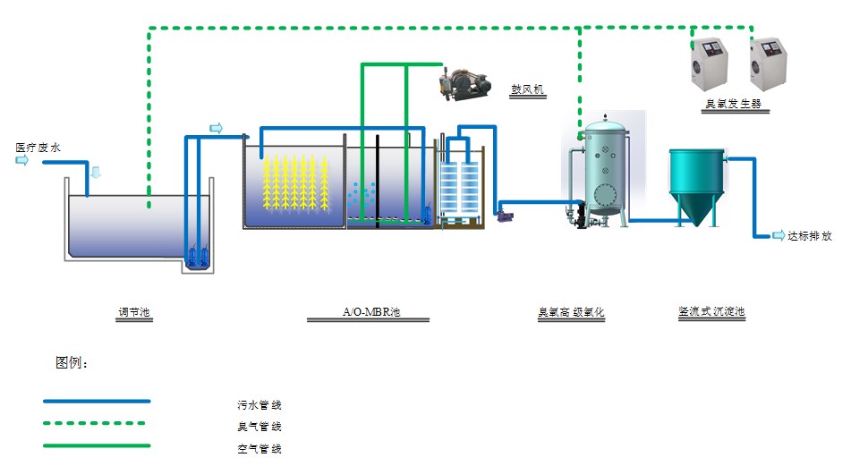 經預消毒調節池後的汙水進入A/O反應池,A/O工藝由缺氧和好氧兩部分反應組成,醫院汙水進入缺氧池後,依次經曆缺氧反硝化、好hao氧yang去qu除chu有you機ji物wu和he硝xiao化hua的de階jie段duan,流liu程cheng的de特te點dian是shi前qian置zhi反fan硝xiao化hua,硝xiao化hua後hou部bu分fen出chu水shui回hui流liu至zhi反fan硝xiao化hua池chi,以yi提ti供gong硝xiao酸suan鹽yan。該gai工gong藝yi充chong分fen利li用yong池chi內nei高gao效xiao生sheng物wu填tian料liao作zuo為wei微wei生sheng物wu載zai體ti,依yi靠kao堿jian性xing微wei生sheng物wu將jiang汙wu水shui中zhong難nan溶rong性xing有you機ji物wu轉zhuan化hua為wei可ke溶rong性xing有you機ji物wu,將jiang大da分fen子zi有you機ji物wu分fen解jie成cheng小xiao分fen子zi有you機ji物wu,以yi利li於yu後hou端duan好hao氧yang池chi進jin一yi步bu氧yang化hua分fen解jie,同tong時shi通tong過guo回hui流liu的de硝xiao態tai氮dan在zai硝xiao化hua菌jun的de作zuo用yong下xia,可ke進jin行xing部bu分fen硝xiao化hua和he反fan硝xiao化hua,去qu除chu氨an氮dan。缺que氧yang池chi在zai前qian,汙wu水shui中zhong的de有you機ji碳tan被bei反fan硝xiao化hua菌jun所suo利li用yong,可ke減jian輕qing其qi後hou好hao氧yang池chi的de有you機ji負fu荷he,反fan硝xiao化hua反fan應ying產chan生sheng的de堿jian度du可ke以yi補bu償chang好hao氧yang池chi中zhong進jin行xing硝xiao化hua反fan應ying對dui堿jian度du的de需xu求qiu。好hao氧yang在zai缺que氧yang池chi之zhi後hou,可ke以yi使shi反fan硝xiao化hua殘can留liu的de有you機ji汙wu染ran物wu得de到dao進jin一yi步bu去qu除chu,提ti高gao出chu水shui水shui質zhi。A/O反應池出水進入MBR進行過濾,進一步去除汙染物,從而使出水達到《醫療機構水汙染物排放標準》(GB18466-2005)中的直接排放標準。