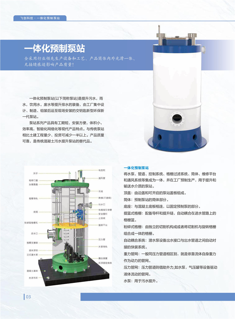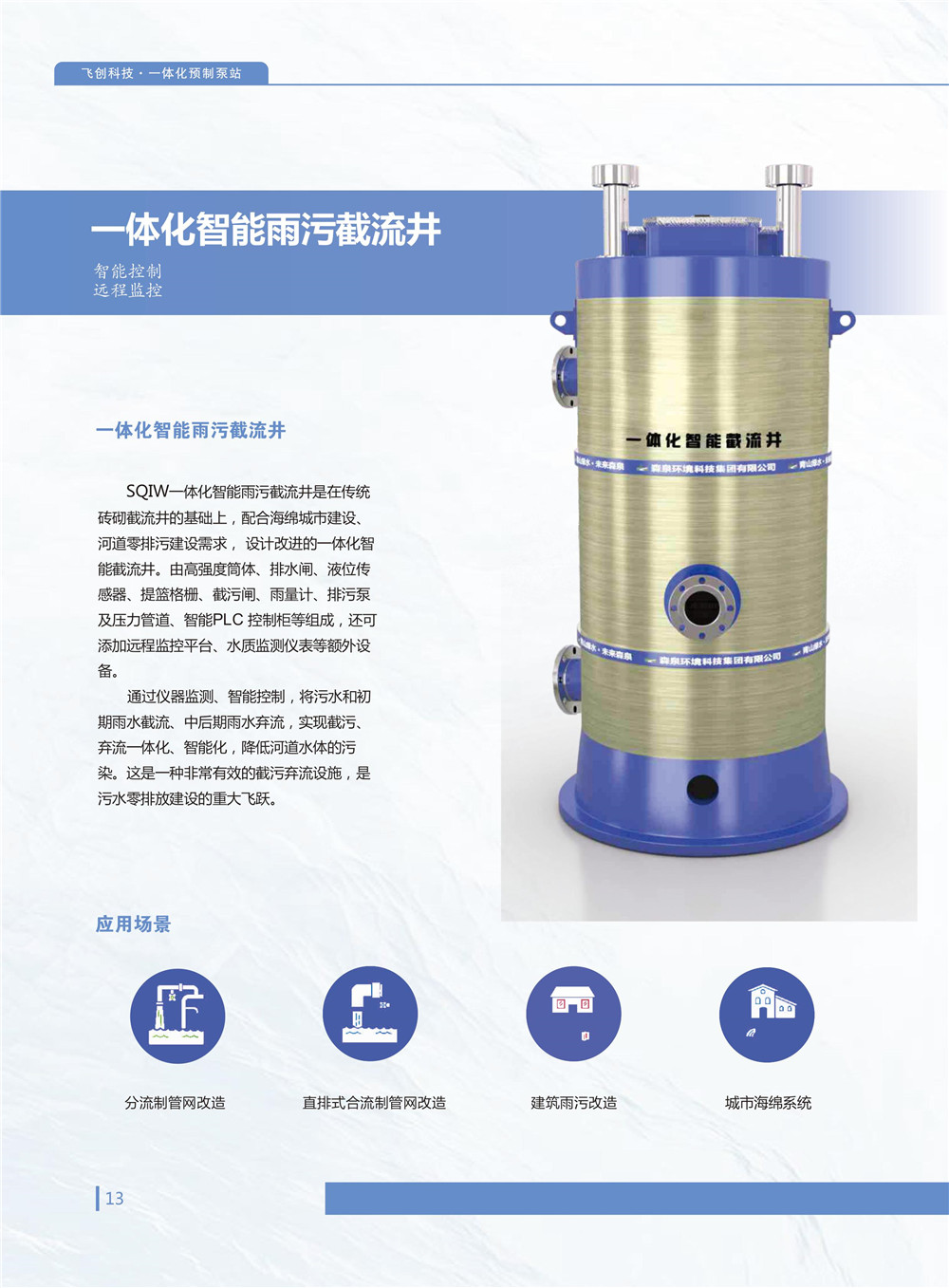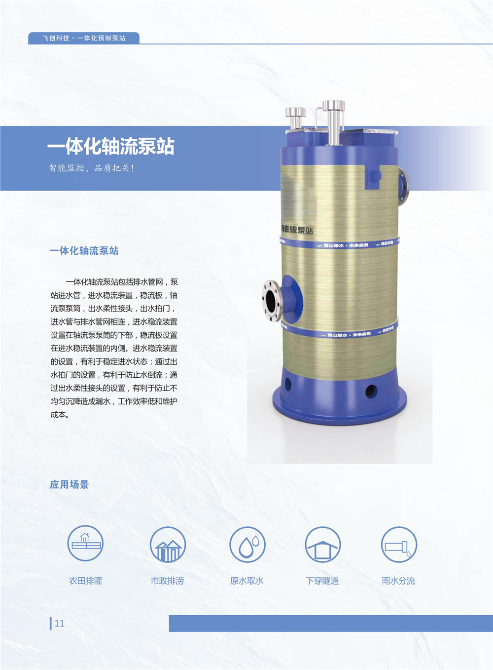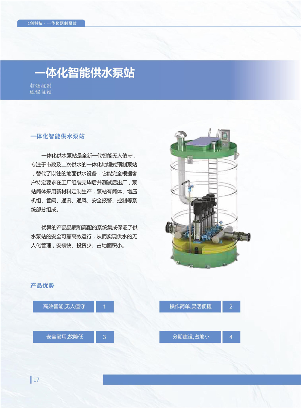 智能一體化泵站,適用於飲用水、汙水、雨水、廢水泵排等應用場景。泵站產品具有工期短,易安裝,體積小,效率高,壽命長,智能化網絡化等現代產品特點,相比傳統泵站係統,土方量少,可節省一半以上投資。
