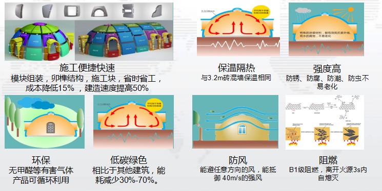 采用改性石墨烯EPS模塊材料建造,該材料具有施工便捷快速、強度高、保溫、隔熱、綠色、節能、環保、低碳、防風、耐火、阻燃等優點。