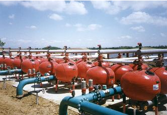 對係統來說,經常性的反洗以清除聚積起來的雜質是必須的。當係統處於反洗狀態時,同組的一個或多個過濾器會將幹淨的、經(jing)過(guo)過(guo)濾(lv)的(de)水(shui)通(tong)過(guo)一(yi)個(ge)三(san)通(tong)反(fan)洗(xi)閥(fa)同(tong)時(shi)倒(dao)灌(guan)入(ru)這(zhe)個(ge)過(guo)濾(lv)器(qi)中(zhong)。在(zai)這(zhe)個(ge)倒(dao)灌(guan)過(guo)程(cheng)中(zhong),被(bei)反(fan)洗(xi)的(de)過(guo)濾(lv)單(dan)元(yuan)的(de)填(tian)料(liao)層(ceng)在(zai)水(shui)流(liu)的(de)衝(chong)擊(ji)下(xia)被(bei)衝(chong)起(qi),雜(za)質(zhi)則(ze)通(tong)過(guo)一(yi)個(ge)三(san)通(tong)的(de)反(fan)洗(xi)口(kou)被(bei)排(pai)出(chu)。在(zai)A.G.F係(xi)統(tong)中(zhong),特(te)殊(shu)設(she)計(ji)的(de)集(ji)水(shui)器(qi)使(shi)填(tian)料(liao)層(ceng)在(zai)反(fan)洗(xi)狀(zhuang)態(tai)時(shi)形(xing)成(cheng)內(nei)環(huan)流(liu),填(tian)料(liao)之(zhi)間(jian)互(hu)相(xiang)搓(cuo)洗(xi),最(zui)大(da)限(xian)度(du)地(di)提(ti)高(gao)反(fan)衝(chong)洗(xi)效(xiao)率(lv),減(jian)少(shao)所(suo)需(xu)的(de)反(fan)洗(xi)水(shui),同(tong)時(shi)反(fan)洗(xi)時(shi)不(bu)跑(pao)沙(sha)。當(dang)反(fan)洗(xi)結(jie)束(shu)時(shi),閥(fa)門(men)又(you)回(hui)複(fu)到(dao)過(guo)濾(lv)狀(zhuang)態(tai),下(xia)一(yi)個(ge)過(guo)濾(lv)單(dan)元(yuan)則(ze)準(zhun)備(bei)進(jin)入(ru)反(fan)洗(xi)狀(zhuang)態(tai)。